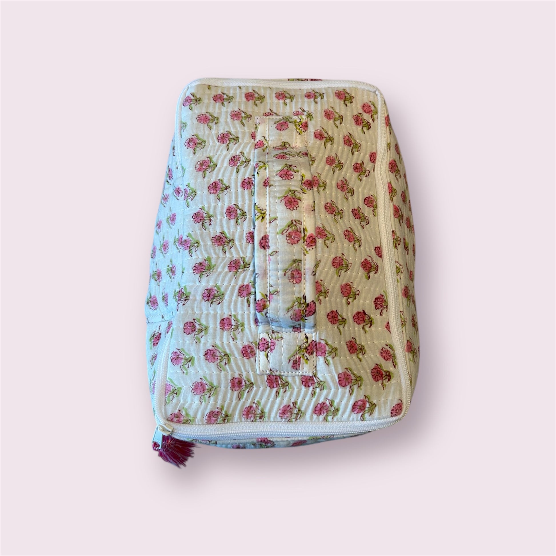 A pretty pink flower and white quilted cotton vanity bag, it’s the perfect size to keep all your cosmetic essentials organised.