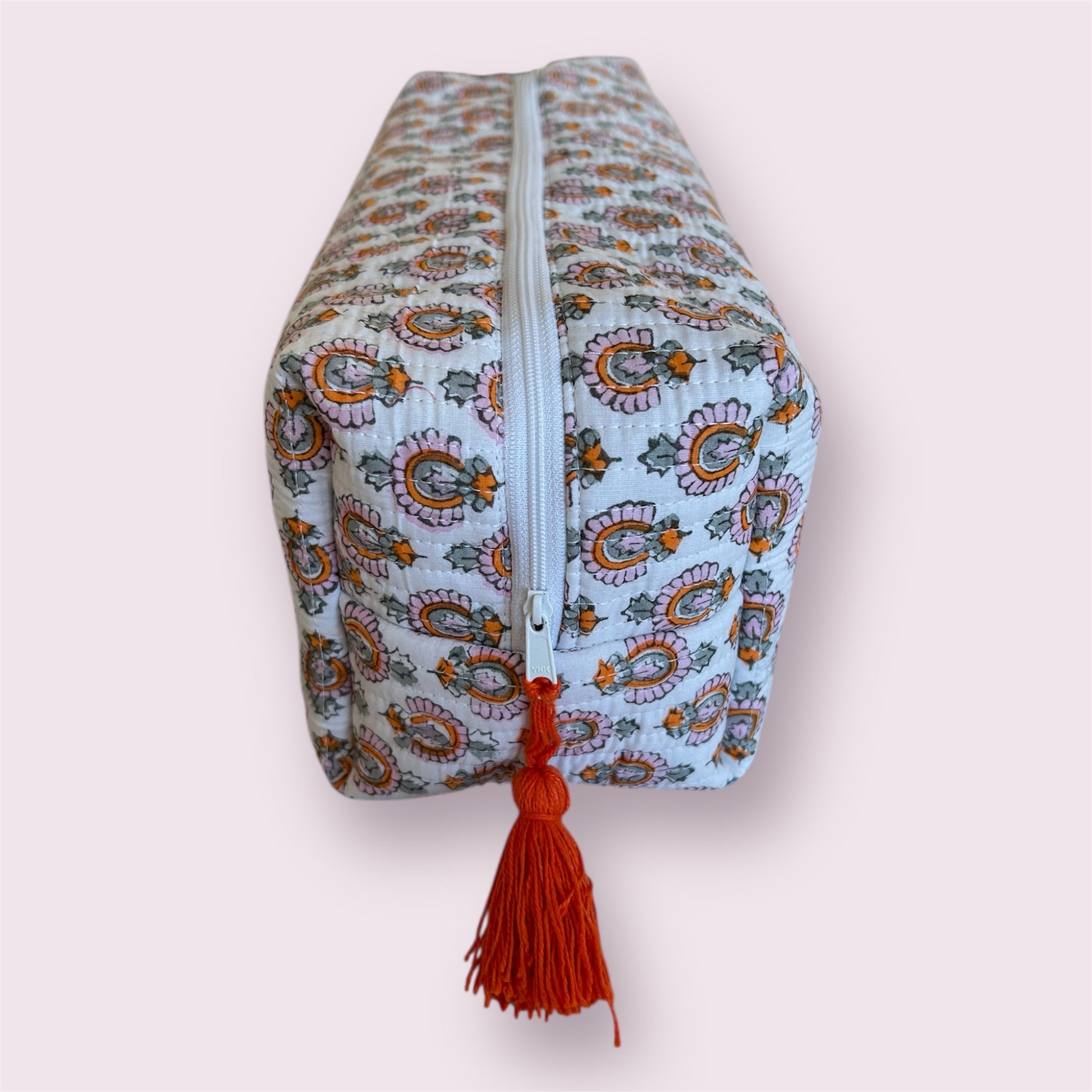 A beautiful vanity bag with vibrant all-over motif and bold orange design quilted cotton accessories bag, it’s the perfect size to keep all your hair styling products and essentials organised.
