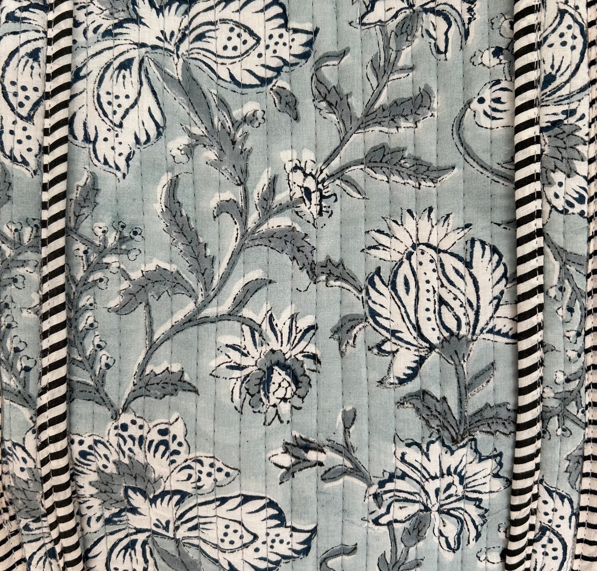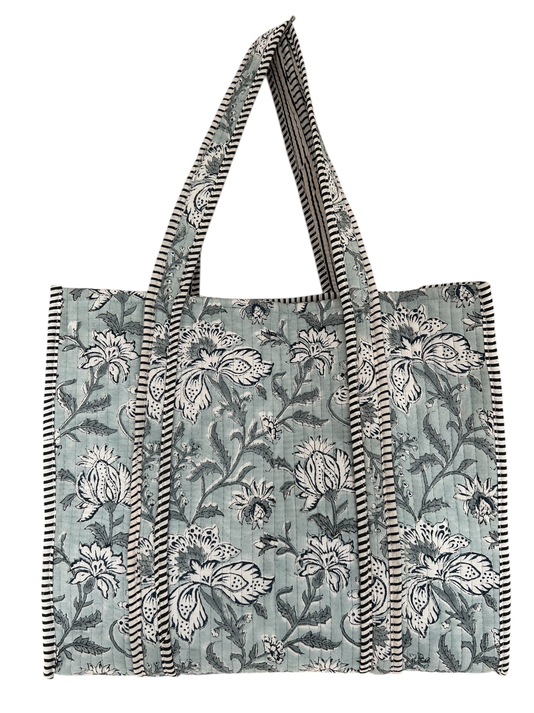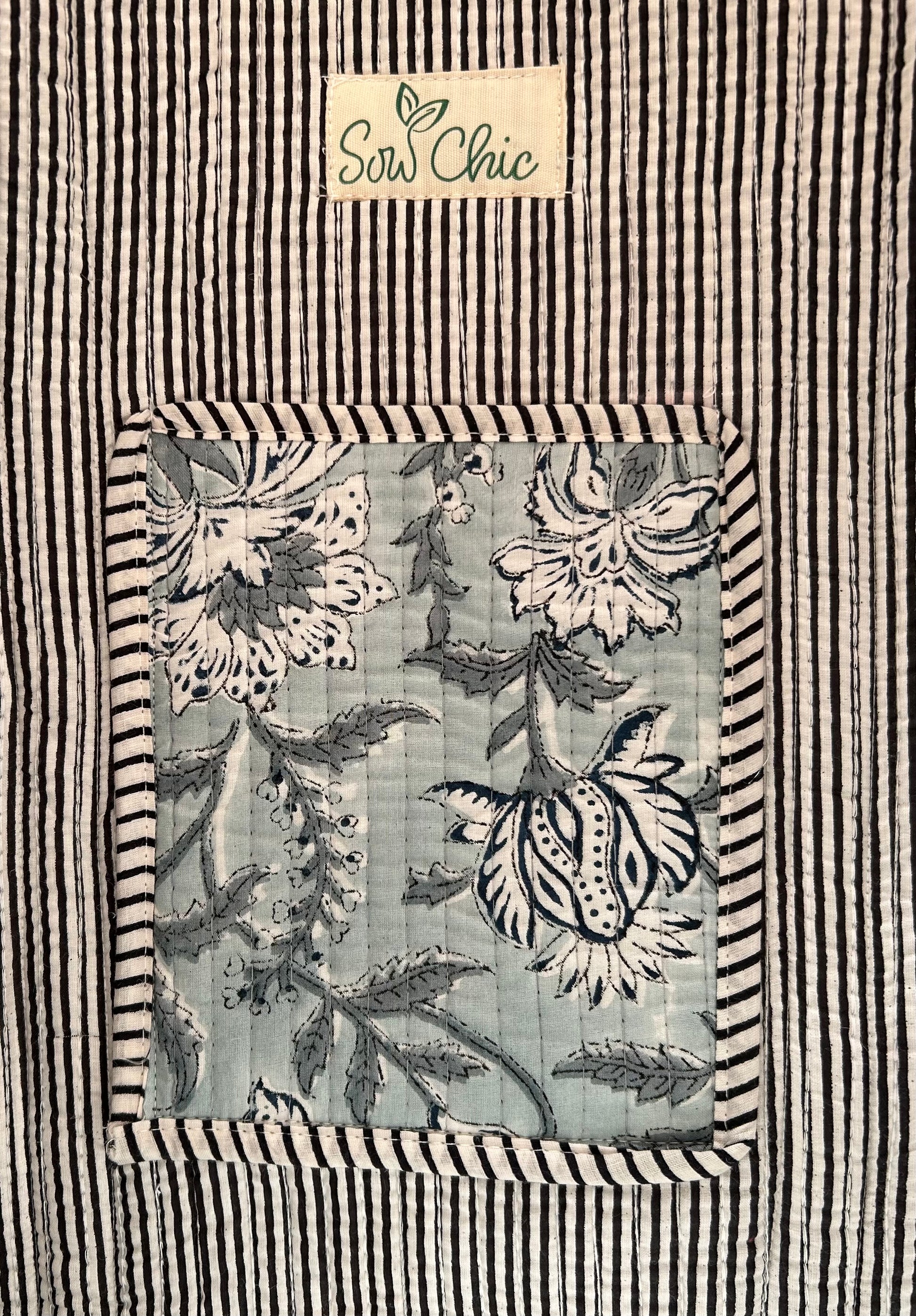 Elevate your everyday style with this beautifully handcrafted Tote bag. Featuring soft grey and botanical prints, with black and white striped pattern trim. Our block print cotton tote bags have been designed and made exclusively for Sow Chic.
