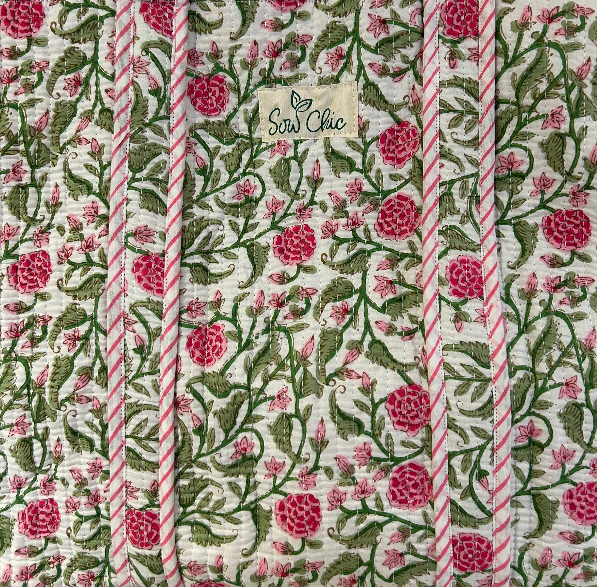 A stunning pink floral and green stems hand block print cotton. Inside has a pink and white stipes block print design.
